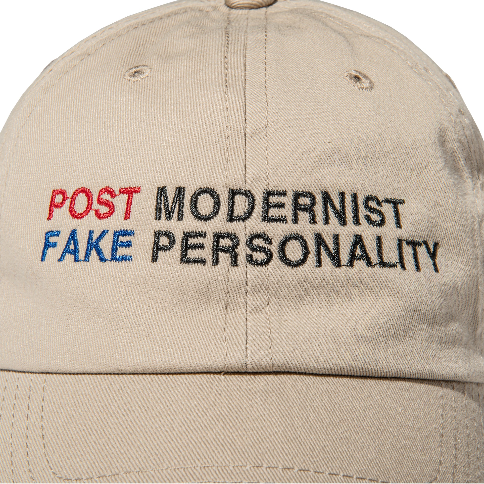 "POST MODERNIST FAKE PERSONALITY"の刺繍を施したベースボールキャップ。